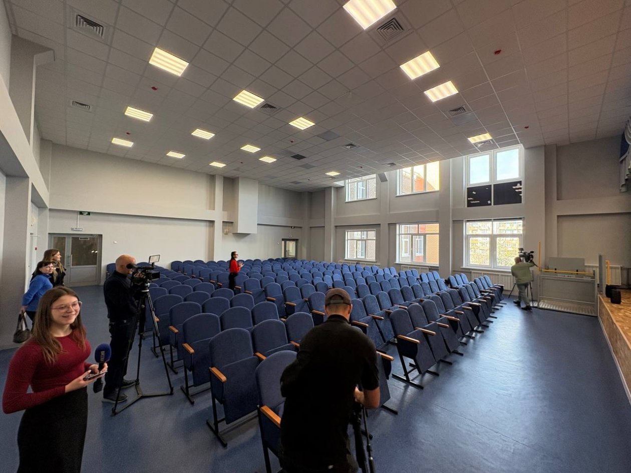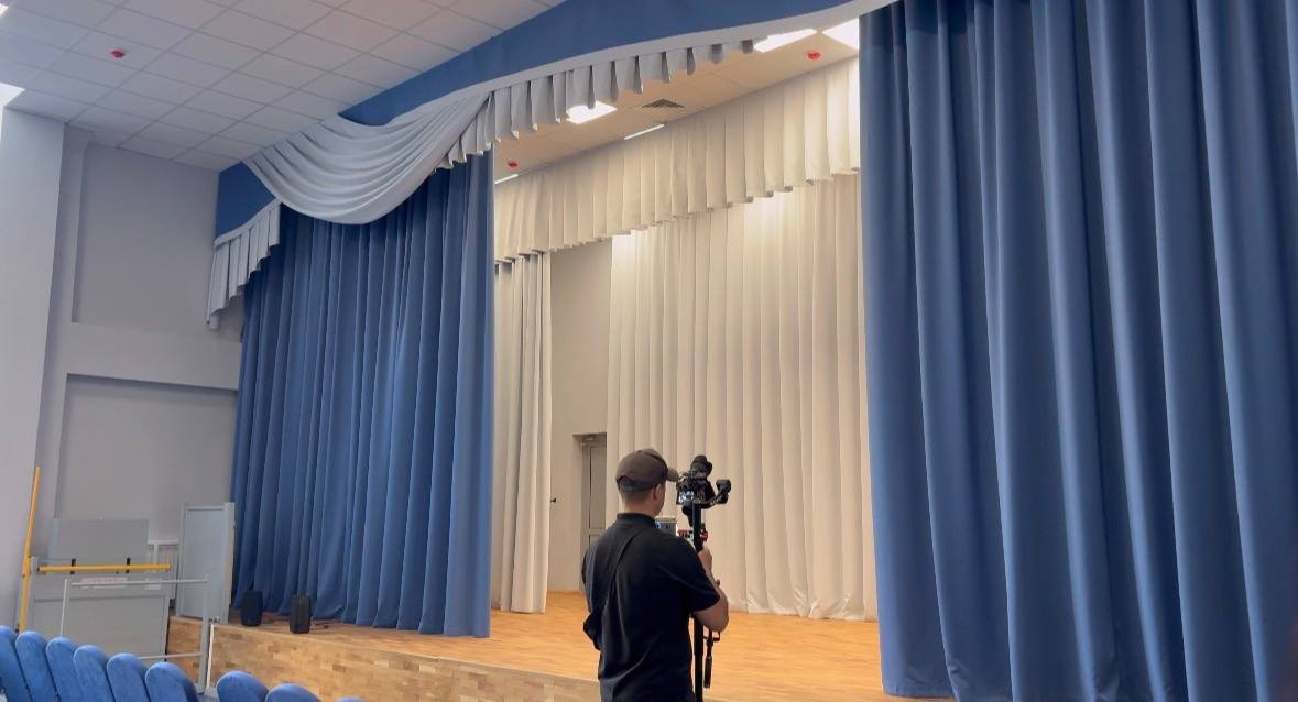 Она уточнила, что в актовом зале одежда для сцены была изготовлена в Санкт-Петербурге специально для школы — всё по размерам. Сама сцена оснащена кулисным механизмом, который автоматически открывается и закрывается в случае необходимости. В актовом зале расположились гримёрные, зал для репетиции, кабинет для инвентаря и даже есть отдельная душевая для выступающих — все находится за сценой. Ранее в актовом зале вместо подъёмного механизма располагался пандус с перилами, но его убрали, чтобы не загораживать обзор зрителям. Само помещение рассчитано на 240 человек.