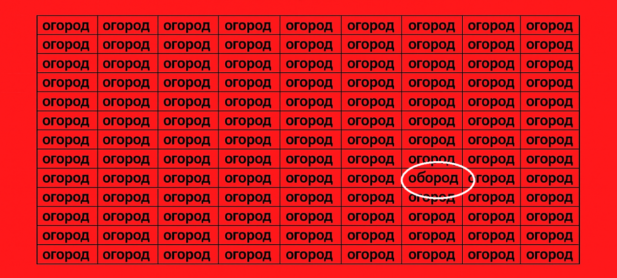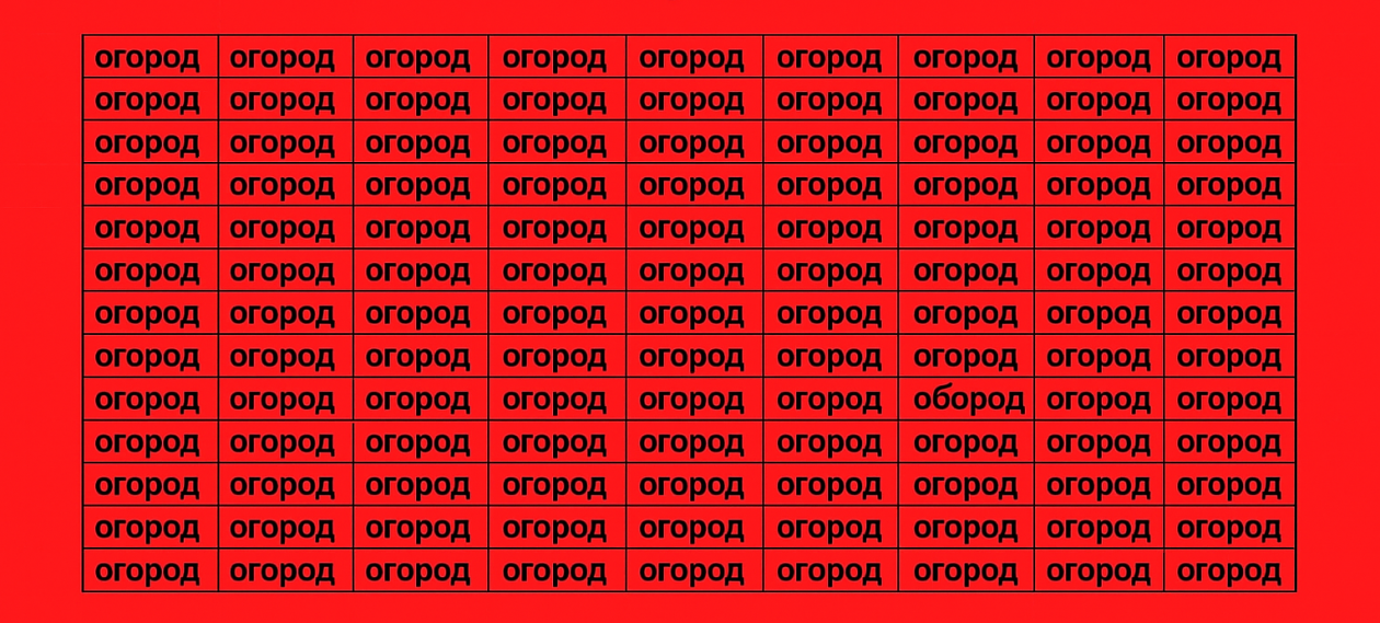 Проверьте свою внимательность. На первый взгляд перед вами обычный квадрат из слов "огород", но среди них спряталась хитрая опечатка.