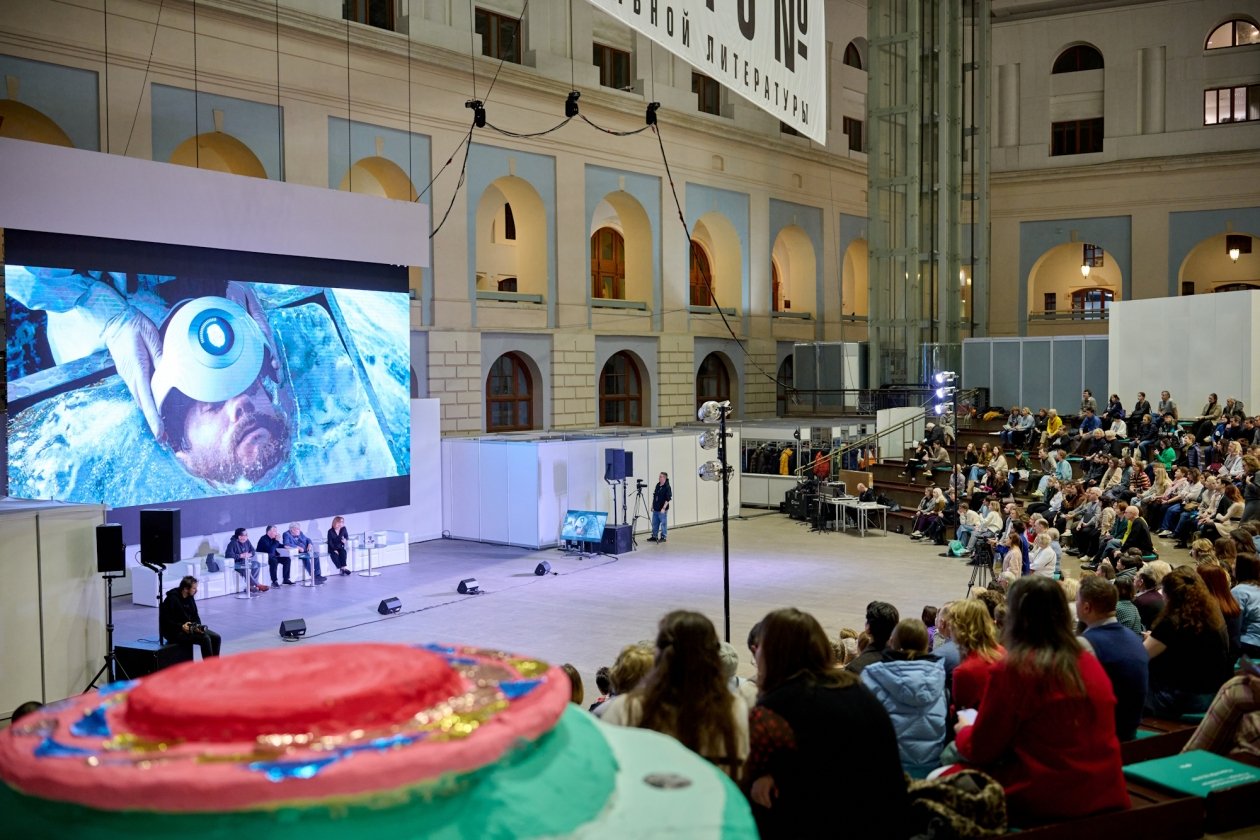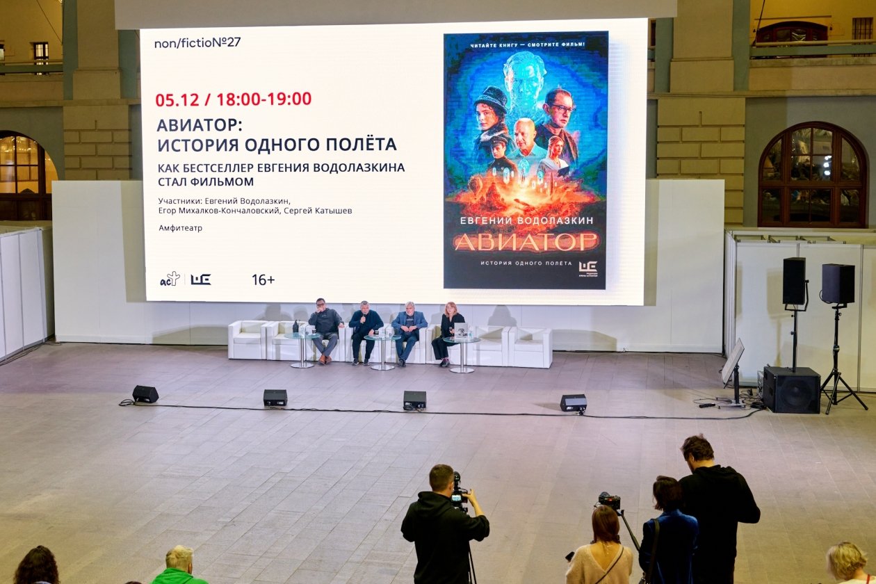 Автор романа, лауреат премии "Большая книга" (16+) Евгений Водолазкин, режиссер Егор Михалков-Кончаловский и продюсер Сергей Катышев в ходе открытой дискуссии подробно рассказали гостям ярмарки о том как создавалась кинокартина и альбом.