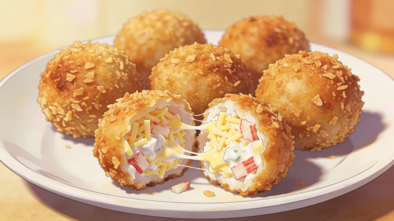 Крабовые палочки и сыр натирают и смешивают с майонезом до густой массы, из которой формируют небольшие шарики. Заготовки сначала окунают во взбитые яйца, затем щедро обваливают в сухарях — так получается плотная золотистая корочка.