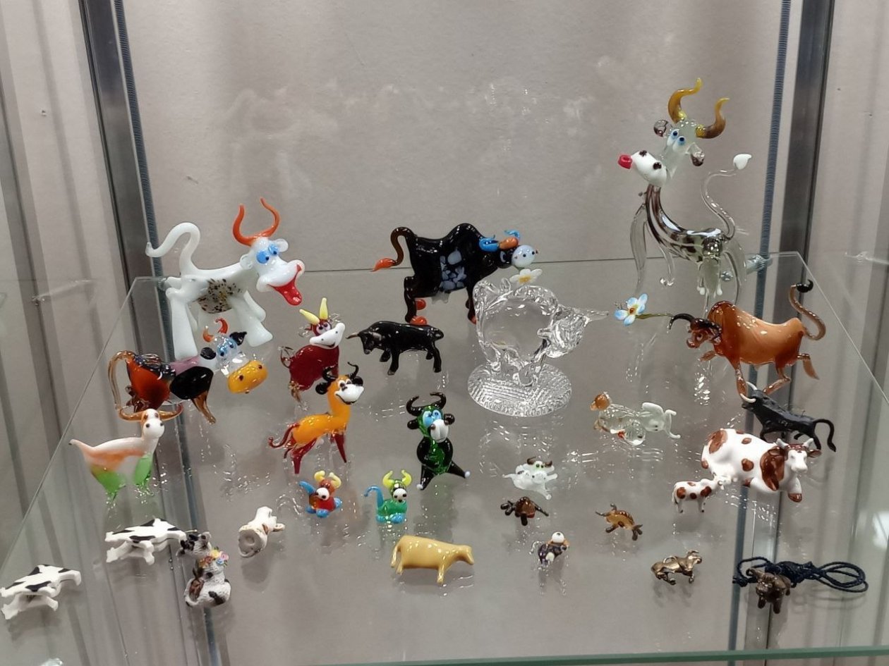 В музее представлены статуэтки, посуда, копилки и изображения с коровами и быками, собранные из разных уголков мира. Экспонаты выполнены из оникса, стекла, гипса и других материалов.