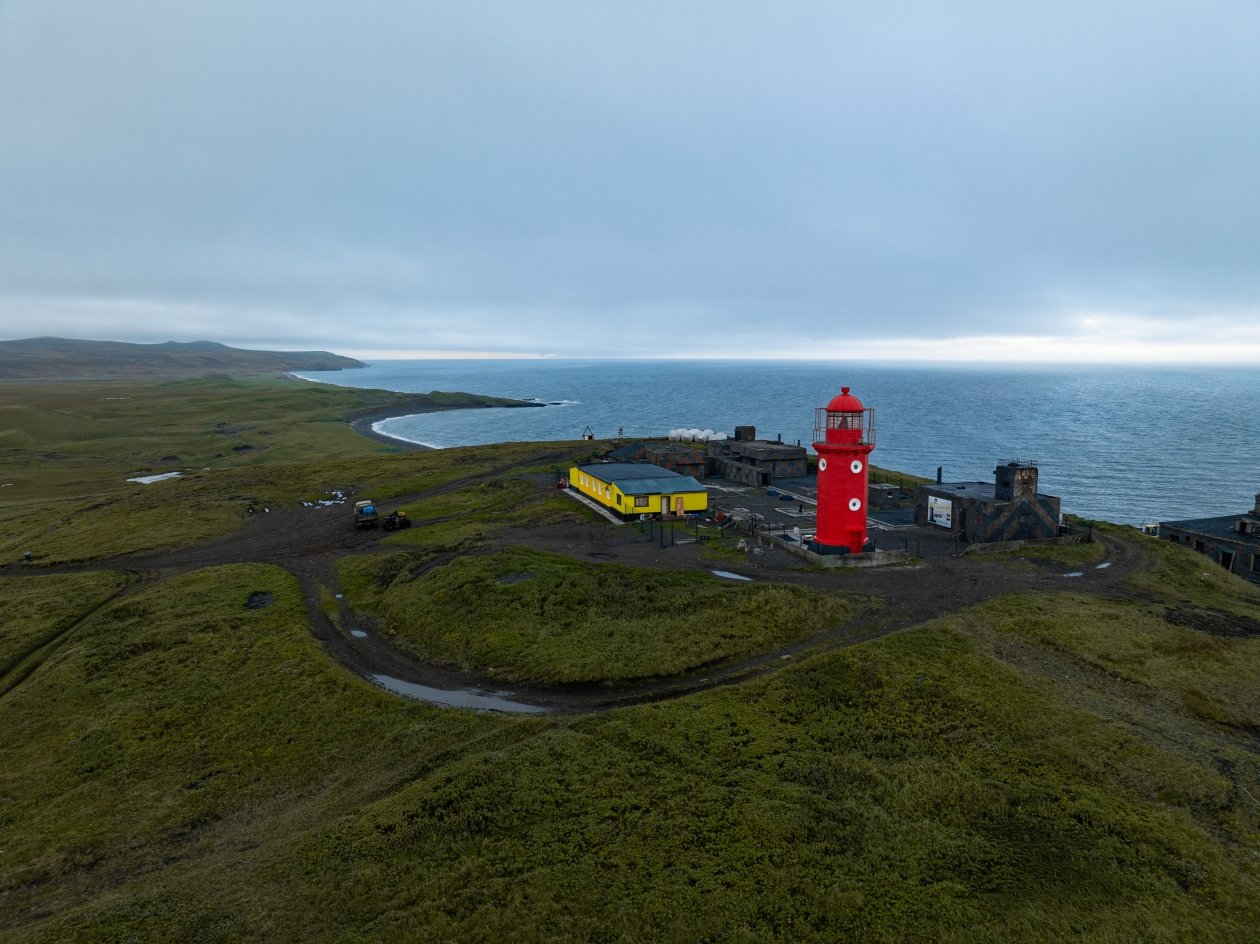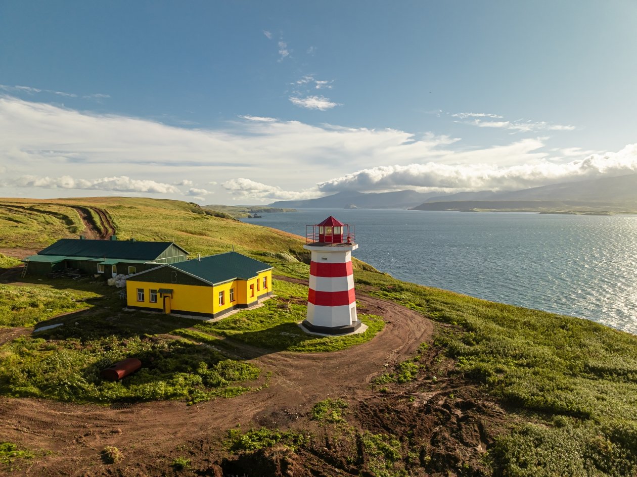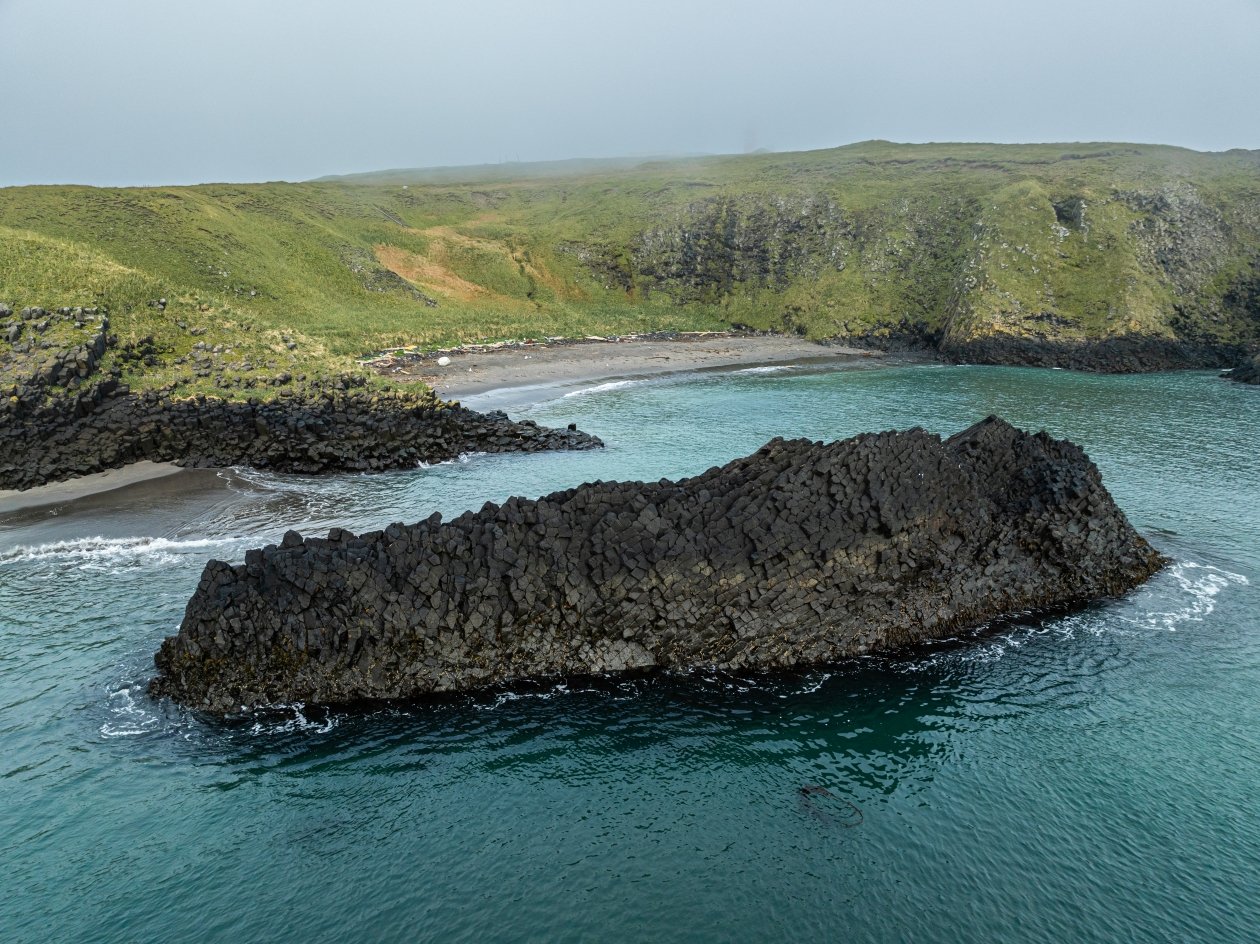 Входит в маршрут и мыс Чибуйный, и маяки на мысах, в частности на мысе Курбатова. Мыс Курбатова — вообще особая история. С суши он кажется скромным, таким скрытым, немного "зажатым". Но когда спускаешься к морю и видишь каменные колонны, эти природные изваяния производят впечатление сказочного мира. И когда все это соединяется — история десанта, поле боя, мемориалы, маяки, суровая погода, океан, каменные столбы — ты понимаешь, насколько многогранен этот остров.