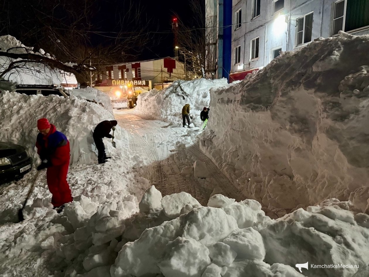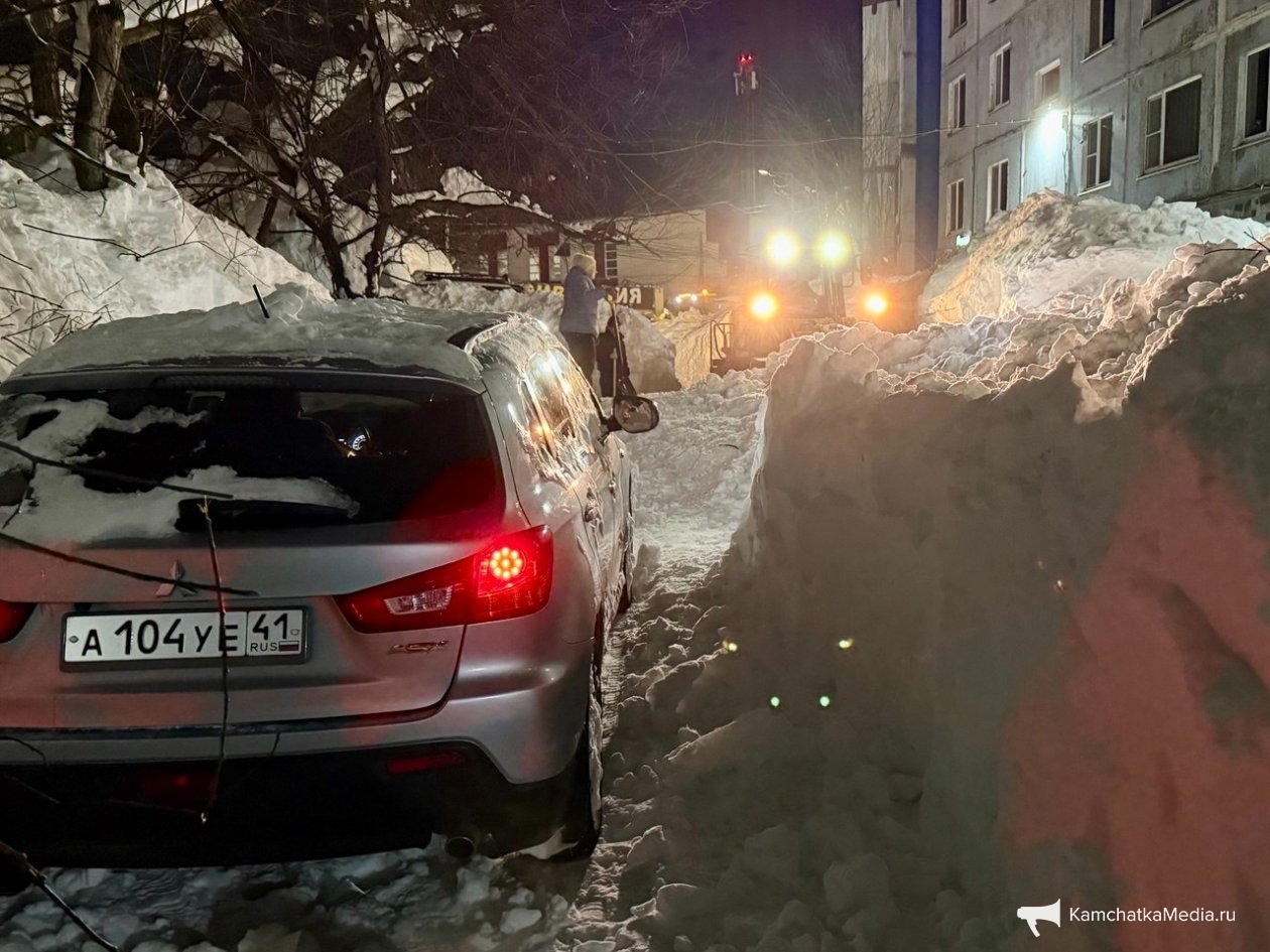 Обычный двор в Петропавловске-Камчатском. Последний раз снег убирали в середине декабря. После всех циклонов проезд полностью заблокирован уже две недели. Невозможно вывезти мусор, проехать пожарным и скорой, подвести товары в окрестные магазины. Попытка погрузчика пробиться в соседний двор закончилась крахом — спецтехника чуть не свалилась в яму со свежеоткопанным автомобилем, а потом превратила въезд в площадку для могула с трамплинами и ухабами.