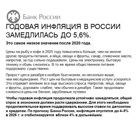 В целом инфляция в России снизилась до 5,6% — это самое низкое значение с 2020 года. Годовая инфляция пока выше цели в 4%. Чтобы она продолжала снижаться, спрос в экономике должен расти медленнее. Для этого нужно поддерживать высокие ставки по депозитам и кредитам. По прогнозу Банка России, инфляция опустится до 4-5% в 2026 году и в дальнейшем стабилизируется около 4%.