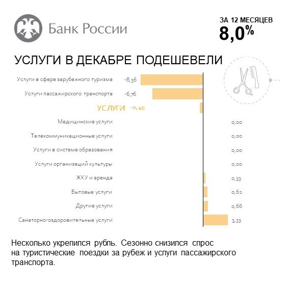 В конце года из-за сезонных скидок подешевели услуги пассажирского транспорта, особенно железнодорожного. За год цены на них выросли незначительно. Снизилась стоимость зарубежных туров из-за сезонного снижения потока и укрепления рубля.