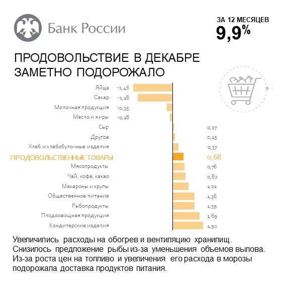 В декабре сильнее всего выросли цены на кондитерские изделия. Доставка ингредиентов и готовой продукции подорожала из-за увеличения стоимости топлива и его расхода в морозы. Некоторые овощи и фрукты тоже выросли в цене. На это повлияли расходы на обогрев и вентиляцию хранилищ, рост стоимости грузоперевозок и спрос перед Новым годом. За год овощи подорожали на 1,8%, фрукты — на 3,9%. Рыбопродукты, особенно охлажденная рыба и филе, тоже стали дороже. Причины — снижение предложения и рост затрат на транспортировку.