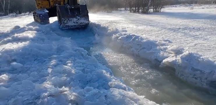 Для устранения наледи провели вскрышные работы, чтобы вода могла свободно выходить и не создавала давления. Устроили водосборный бассейн, отбойный вал и отсыпали 64 кубометра грунта.