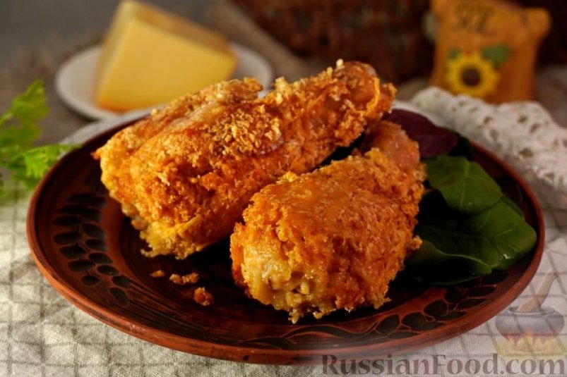 Каждую голень обваливаем в муке. Затем окунаем в яичную смесь. После этого тщательно обваливаем голени в смеси сухарей и сыра, слегка прижимая панировку руками.