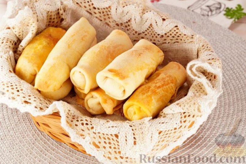 Оставляем под плёнкой на полчаса. Тесто делим на равные небольшие кусочки (примерно 8 штук). Кусочек теста раскатываем в очень тонкий овальный пласт. Ближе к краю теста выкладываем начинку. Накрываем начинку краем теста. Края с двух сторон также заворачиваем.