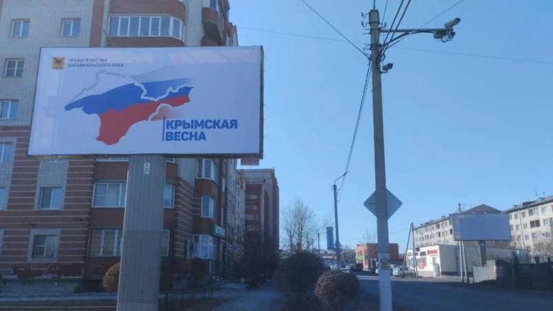ChitaMedia, 17 марта. На улице Крымской в Чите появились два баннера с картой Крымского полуострова и надписью "Крымская весна". Акция (6+) приурочена к межрегиональному марафону "Крым — Россия! Навсегда!" (6+). Об этом сообщает пресс-служба краевого правительства.