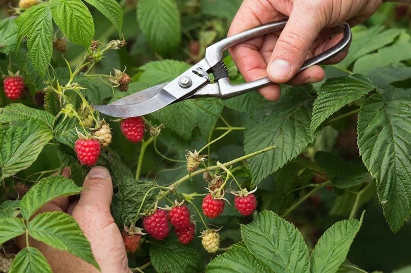 Обычная малина: Срежьте сухие, тонкие (менее 0,7 см) и повреждённые побеги у основания. Оставьте 5–7 стеблей, укоротите на 1/4 для боковых веток.