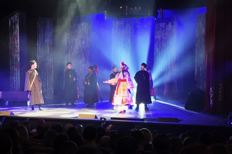 Ну и, конечно, полёт паночки. Технически сложное решение, но девушка в этот момент действительно находится над сценой (и нет, она не просто висит на канате). При этом ветер треплет её саван, а она успевает петь и весьма правдоподобно играть. Вообще поразительно, но изначально все участвующие в спектакле люди — не актёры, а артисты хора.