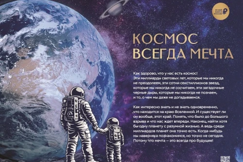 Выставка приурочена к 65-летию первого в мире полёта человека в космос. На увеличенных изображениях монет запечатлены знаковые моменты отечественной космонавтики: полёт Юрия Гагарина, работа космодрома Байконур, история первой женщины-космонавта Валентины Терешковой, а также портреты выдающихся учёных и конструкторов.