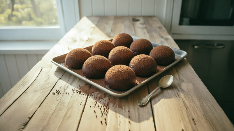 Формирую пирожные — у меня получилось 13 штук по 55 граммов каждая. Для обсыпки буду использовать какао и сахарную пудру. Смешиваю их вместе, при необходимости можно просеять. Хорошо обваливаю в этой смеси каждый шарик. Для красоты и вкуса украшаю пирожные из кулича грецкими орехами.