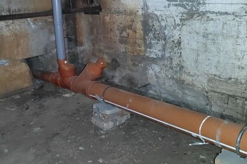 При капремонте водоотведения провели полную замену розливов на новые пластиковые трубы, заменили отводы, тройники и ревизии, выполнили ремонт и герметизацию стыков, восстановили вентиляционные выходы на крыше и вывели фановые стояки за пределы кровли.