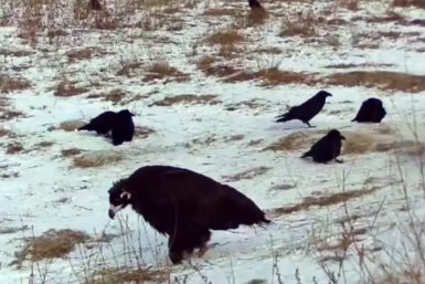 Фотоловушка зафиксировала чёрного грифа в компании ворон в Забайкалье