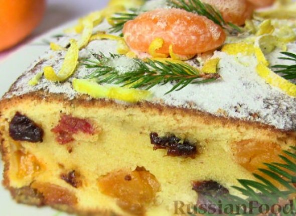 Добавить в тесто остывшие сухофрукты и аккуратно перемешать.Форму смазать сливочным маслом и присыпать мукой. Выложить тесто, перекладывая мандаринами. Выпекать рождественский кекс около часа при температуре 180 градусов. Готовность кекса проверить деревянной палочкой.