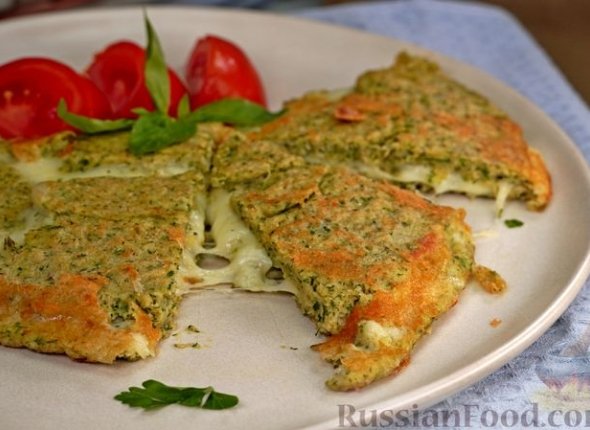 Перемешиваем до однородности. Разогреваем сковороду с маслом и выкладываем на неё овсяную массу. Жарим блин примерно по 3 минуты с каждой стороны. Сыр натираем на крупной тёрке.