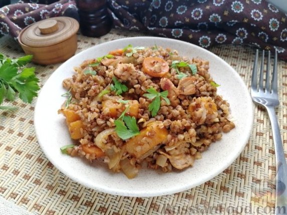 Гречка с курицей, тыквой и морковью готова. Дайте блюду настояться ещё 10 минут и подавайте к столу, украсив нарезанной петрушкой.
