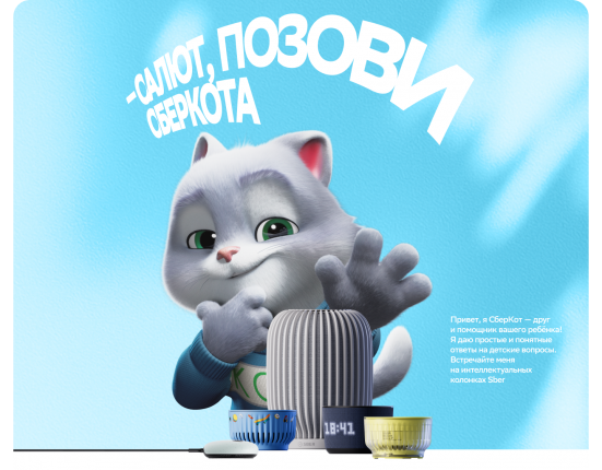 СберКот успел хорошо зарекомендовать себя в работе с детьми — как друг, с которым можно поговорить на разные темы, так и советчик по финансовым вопросам. В новой роли в качестве детского персонажа в колонках, он также поддерживает любознательность, дает полезные рекомендации, а еще включает музыку и проактивно вовлекает в беседу маленьких непосед. При этом разговаривает с ребёнком на одном языке и никогда не даст вредный совет, так как бережно подбирает формулировки при общении с детьми.