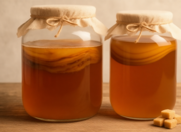 Комбуча содержит живые культуры бактерий и дрожжей, которые могут улучшать баланс кишечной микробиоты, помогая пищеварению и снижая риск дисбактериоза.