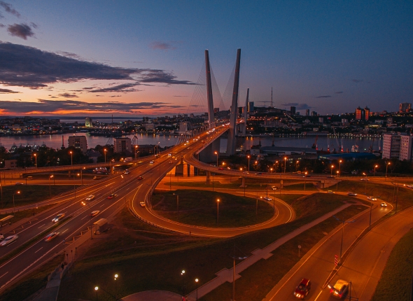 ночной Владивосток, ночь, город, закат , Чуркин, Золотой мост, лето, вечер, дорога, развязка
