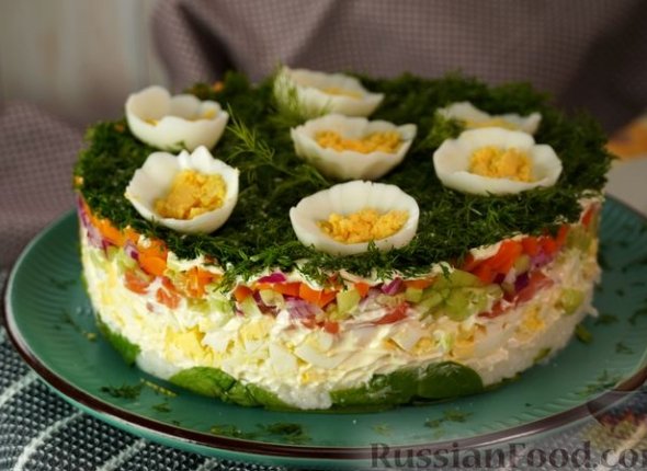 Укроп мелко рубим. Посыпаем укропом верхний слой салата. Сверху выкладываем цветы из яиц. Снимаем кольцо и плёнку (если использовали).