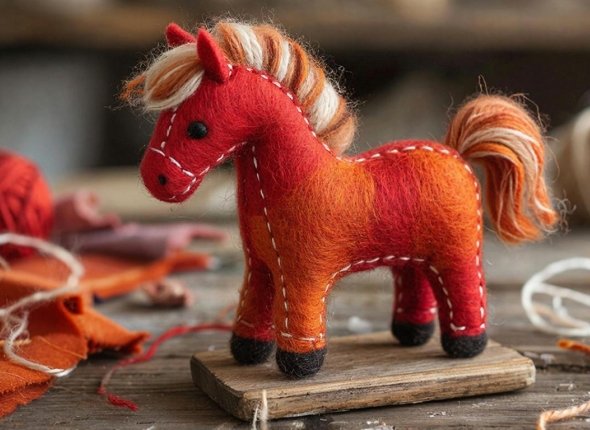 Что понадобится: Фетр ярких оттенков (красный, оранжевый, золотой), ткань для гривы и хвоста (пряжа, ленты, ткани с текстурами), игла и нитки, картон для выкройки.