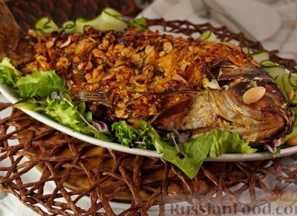ChitaMedia, 13 декабря. Целый карп запекается под слоем обжаренного лука, панировочных сухарей и миндальных лепестков. Слегка хрустящая корочка сохраняет все соки внутри, рыба получается очень нежной и сочной. Рецепт публикует ИА ChitaMedia.