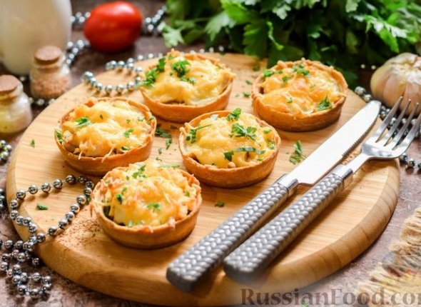Смешать соус с курицей и грибами, разложить по тарталеткам.