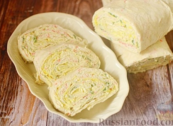 ChitaMedia, 17 декабря. Готовим рулет из трех листов лаваша с начинкой из крабовых палочек, яиц, плавленого сыра и укропа. Эта закуска получается не только вкусной, но и красивой. Рецепт публикует ИА ChitaMedia.