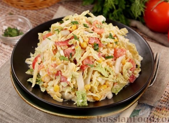 Варим и остужаем яйца. Пекинскую капусту нарезаем тонкими полосками, а помидоры нарезаем небольшими кубиками. Твёрдый сыр натираем на крупной тёрке.