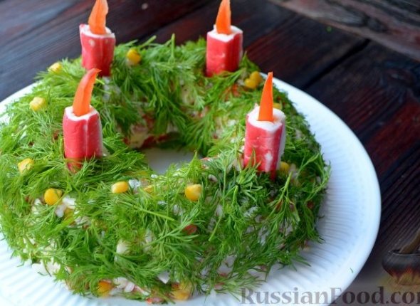 В центр плоской тарелки поставьте перевернутый стакан, вокруг него кольцом выложите крабовый салат. Прижмите его немного тыльной стороной ложки. Сверху воткните "свечи" из половинок крабовых палочек и кусочка помидора. Украсьте салат "Рождественский венок" свежим укропом, можно добавить несколько зерен кукурузы.