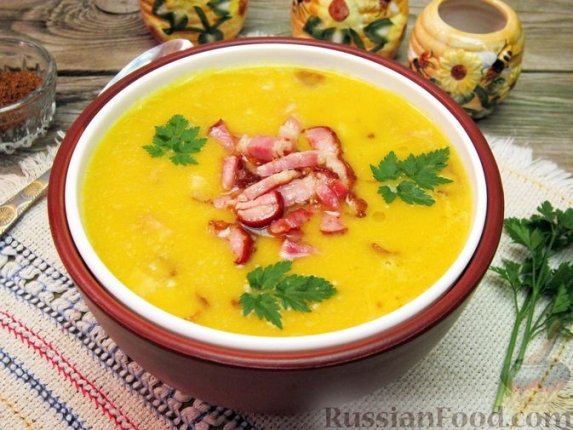Грудинку, нарезанную полосками, также обжариваем около 2 минут. Когда горох станет мягким и начнет развариваться — добавляем к нему лук с морковью и смесь перцев. Варим суп еще 15 минут, затем вместе с овощами переливаем суп в блендер и превращаем его в пюре.