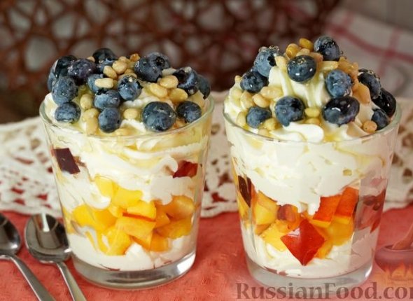 Сверху выкладываем творожную массу (ложкой или с помощью кулинарного мешка). Затем повторяем слои персика и творожной массы. Сверху украшаем ягодами, орешками и поливаем тонкой струйкой мёда.