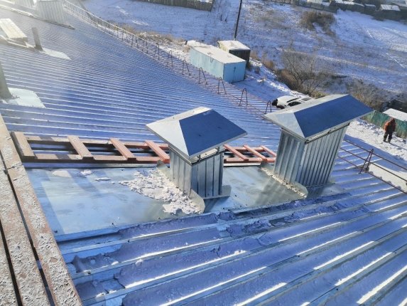 Во время работ уложили новую кровлю из стальных профилированных листов. Над вентиляционными шахтами установили зонты из листовой стали. Кровельные ограждения оборудовали перилами. Также смонтировали элементы каркаса.