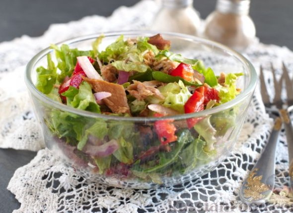 Кусочки консервированного тунца (без жидкости) немного разомнем вилкой в выложим в салат.