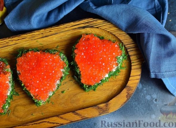 Яркие и вкусные бутерброды-сердечки с плавленым сыром, укропом и красной икрой — отличный вариант праздничного угощения в День святого Валентина. Рецепт публикует ИА ChitaMedia.