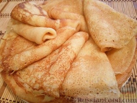 Хорошо разогреваем сковороду, смазываем растительным маслом. Жарим тонкие блины на огне выше среднего. Чтобы перевернуть блинчик, аккуратно поддеваем края лопаткой.