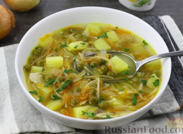 Куриный суп с вермишелью и консервированным горошком готов.