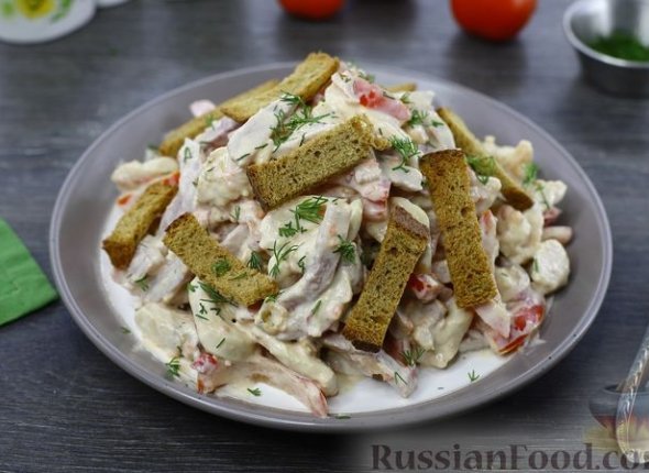 Этот сытный и вкусный салат с курицей, ветчиной и сухариками подходит для любого стола. Сочные свежие помидоры, нежное куриное филе, ароматная ветчина и ароматная зелень — каждый ингредиент в этом салате гармоничен. Заправка с майонезом, аджикой и чесноком делает блюдо особенно ярким по вкусу. Рецепт публикует ИА ChitaMedia.