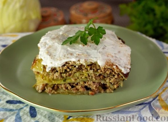 Мусака — многослойная запеканка с овощами. Рецепты есть разные, это один из простых вариантов — без традиционных баклажанов и помидоров. Мясной фарш обжаривается с луком и зеленью. Фарш и листья капусты выкладываются слоями, посыпаются сверху панировочными сухарями, и всё запекается до хрустящей корочки. В конце приготовления мусака дополняется сметаной. Рецепт публикует ИА ChitaMedia.