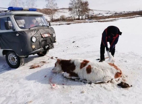 В Агинском районе Забайкалья сотрудники поисково-спасательного подразделения "Забайкалпожспас" спасли корову, которая провалилась под тонкий весенний лед на реке Ага. Животное не пострадало и было благополучно возвращено хозяину. Об этом сообщается в телеграм-канале (18+) правительства Забайкалья.