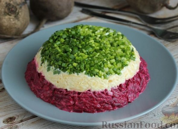 Слоёный салат из свёклы с сыром и зелёным луком готов, можно подавать.