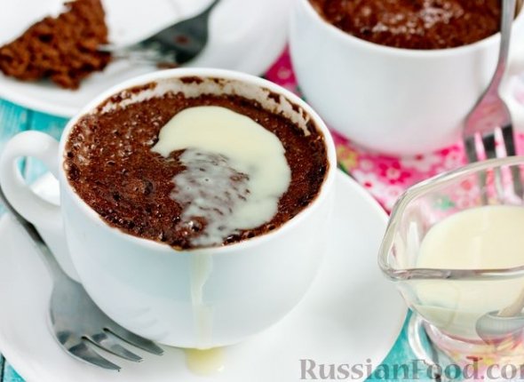 Подавайте шоколадные кексы в чашках. По желанию кексы можно полить сгущёнкой, так они будут более сочными!