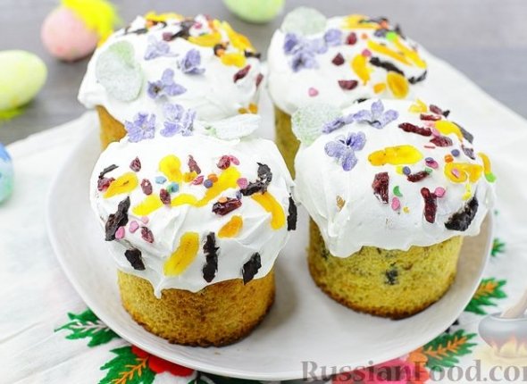 Я добавляю много сахарной пудры — так глазурь получается густой, не течёт. Вы делайте такую консистенцию, которая вам больше по вкусу. Щедро смажьте куличи белковой глазурью. Украсьте кондитерским декором. Оставьте на время, чтобы глазурь подсохла.